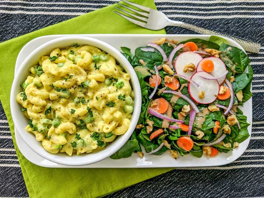 We’re also serving up a childhood favorite with a twist: Cheesy Mac & Peas and Simple Spinach Salad. The mac is creamy and nostalgic, while the fresh greens keep things balanced and light.